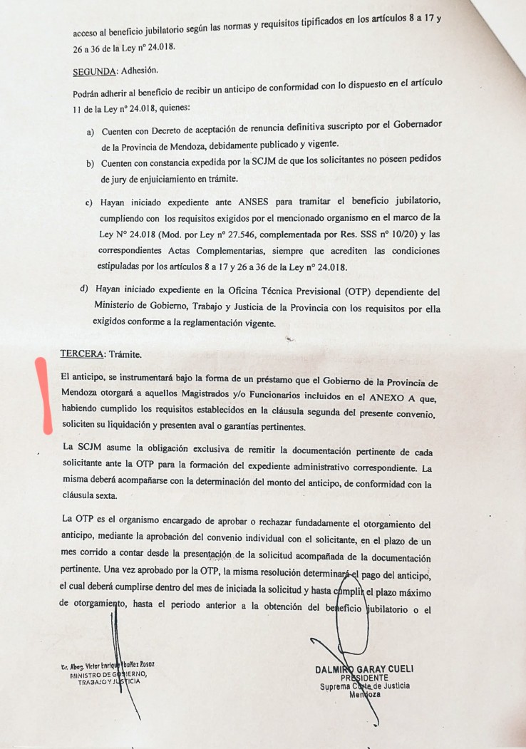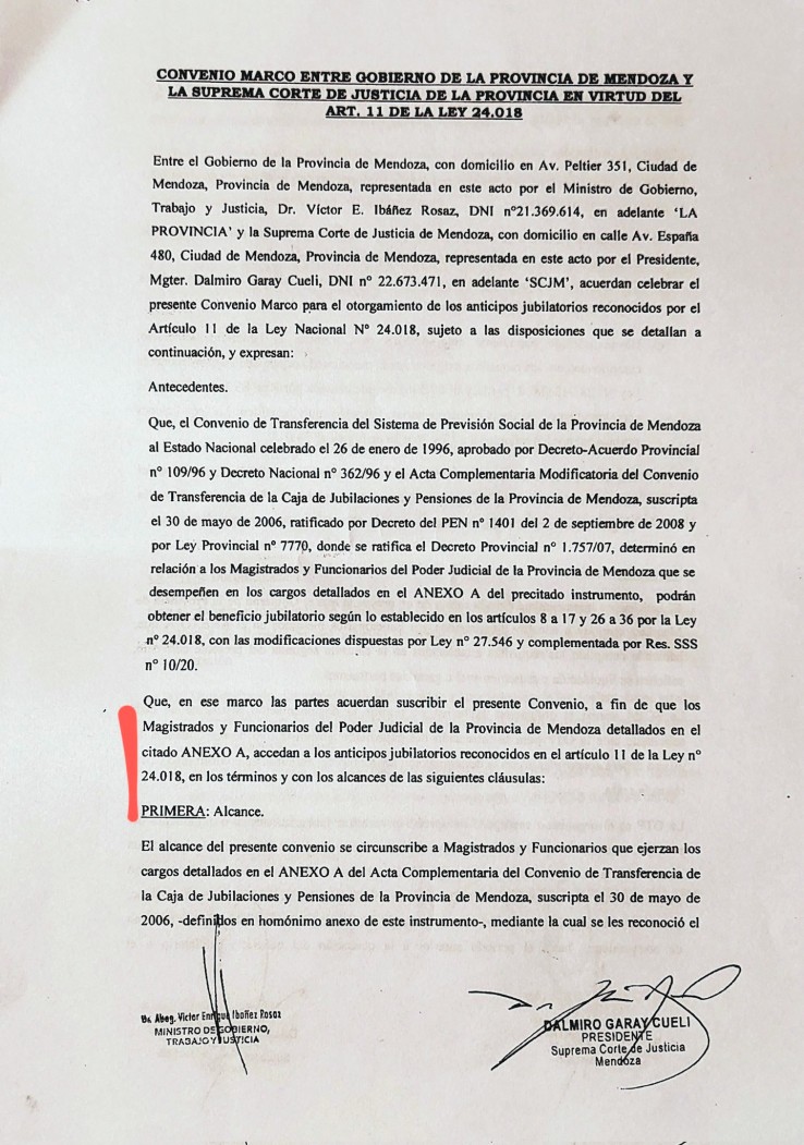 Hace más de un mes y en el más completo sigilo, el gobernador Rodolfo Suarez, firmó un convenio con el Presidente de la Corte y ex funcionario de Alfredo Cornejo, Dalmiro Garay, mediante el cual el Estado Provincial, destinará fondos millonarios «para anticipar el pago de jubilaciones a jueces y otros funcionarios judiciales».